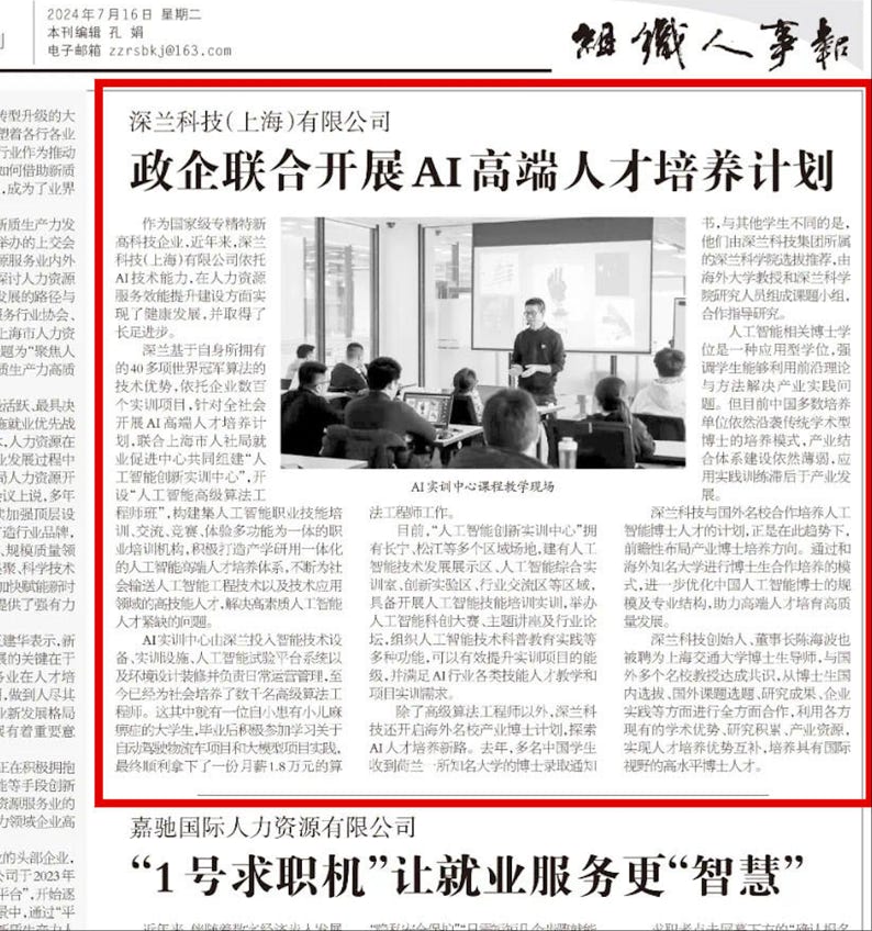 深兰教育助力残疾人学员获得 AI算法岗位获得上海市委报纸《组织人事报》报道
